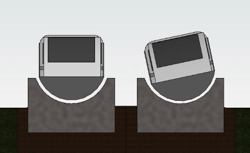 In the following image we can verify the similarities between the two systems, but the great difference between them consists in its curve layout, in which the proposed system does not need static superelevation. This system can rotate on the rail and apply the angle that it needs according to the speed while travelling, ensuring a greater comfort to the passengers and facilitating the constructive process with respect to the construction of the curved rail. The proposed system adapts to the speed, looking for the ideal rotation position.