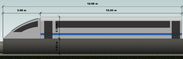 The vehicle has dimensions like those of the Transrapid, where they only differ in the lower area of the vehicle where it interacts with the rail.