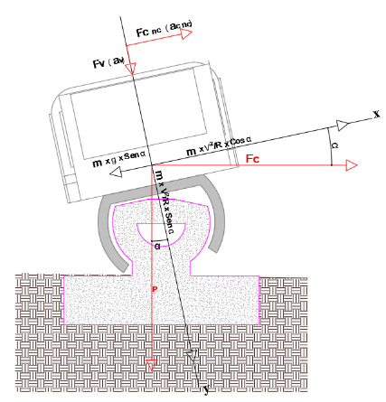 It should be noted, however, that to obtain the correct comfort value for passengers, the calculation of unbalanced acceleration is used, which consists of subtracting the component from the centrifugal acceleration with the acceleration component due to the weight of the vehicle. These acceleration components are schematically shown in the following figure.