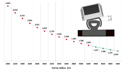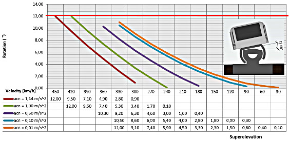 The following image shows the possible inclination (rotation) for the operating speeds and the unbalanced acceleration for each speed considering a radius of 4440 m. It is verified that all the values of the lateral unbalanced acceleration are within the comfort parameters. The acceleration depends on the speed and therefore these values can always be adjusted in a curve, according the inclination and the comfort values admissible for the acceleration.