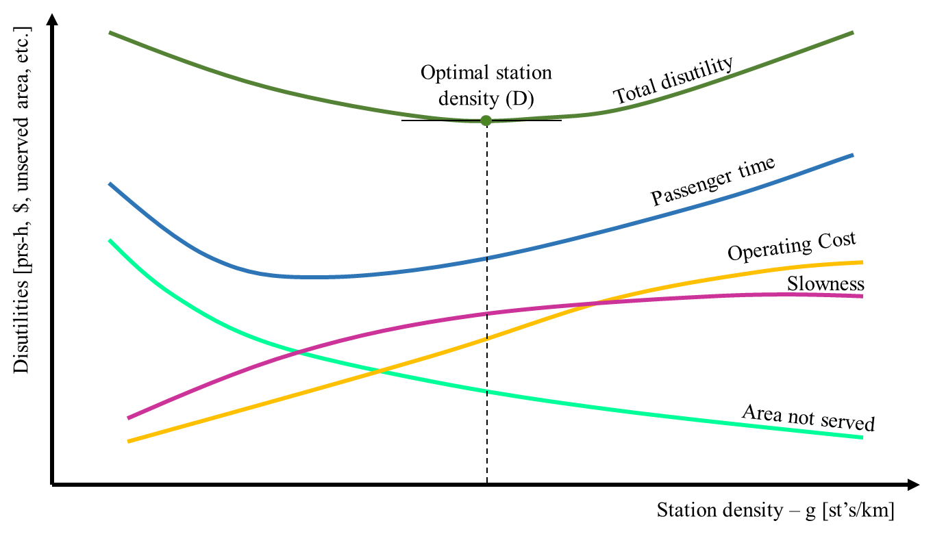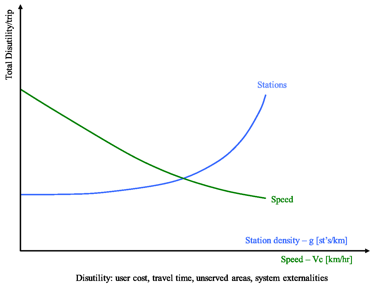 Station Density vs. Speed. Transit operation has a sensitive relationship between the number of stations and speed or disutility. As shown in Fig. 2, when station density g [st’s/km] is low (say, only two terminal stations for a single line), travel speed can go very fast, but the total disutility is also very high, mainly due to lots of unserved areas (resulting in low ridership). As the station density increases, speed will become lower, then more passenger will be served although the overall travel time increases. This also results in a lower cost per passenger.
