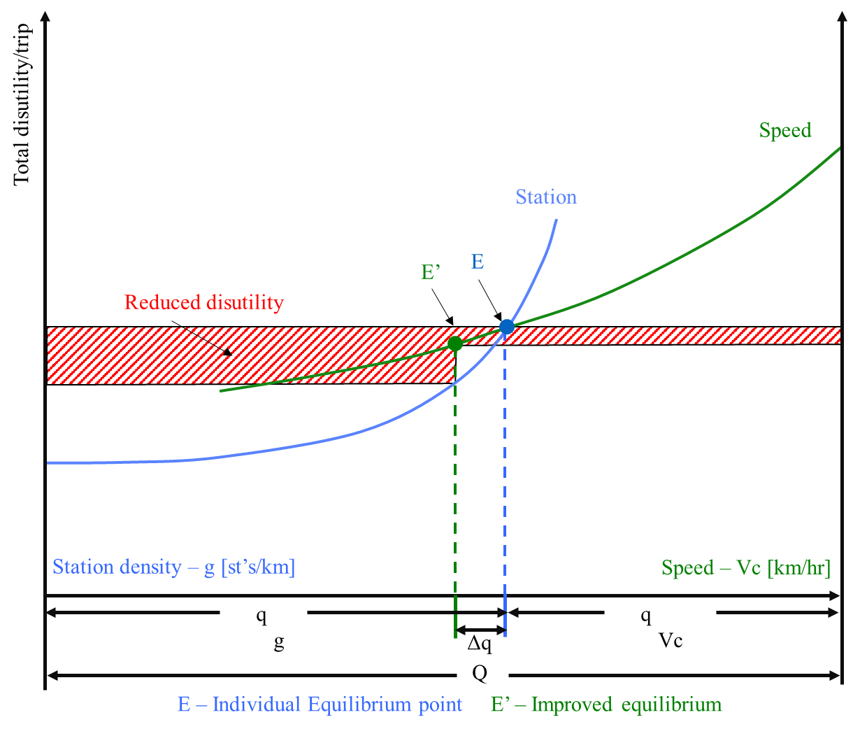 Fig. 3 shows distribution of Q stations in a single line (from the left) and speed (from the right). Transit operators mostly operate trains under the lower disutility scenario, the distribution between stations and speed will be at the equilibrium point E: qg, the number of station, and qvc, the operating speed. This situation can be seen in the real world where there is a high-speed maglev with an average speed of 350 km/hr and a high-speed rail (HSR) line with an average speed of 250 km/hr. If one could make an impact on the other, for example, Δq shows the number of travelers deciding to travel on a single line when the number of stations decreases, its operating speed can be increased. Therefore, the travelers on the line would benefit, so identifying station density and speed leads a system optimum – minimum total disutility.