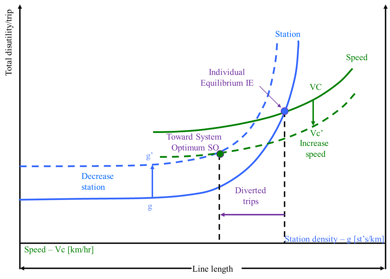 Fig. 4 shows how these two sets of measures result in a shift of the equilibrium point from the individual equilibrium point (IE) toward the system optimum (SO): to increase speed move the VC curve down to VC’, whereas station density moves the g curve up to g’. The result is a shift of operating more stations to fewer stations so that trains can travel at a higher speed, known as skip-stop and express services, this goes from the initial IE toward the SO by the individual decisions of travelers and operator, and it remains stable there. The diagram shows that the total disutility of travel in both modes, which was initially at the IE level, and has been reduced to SO.
