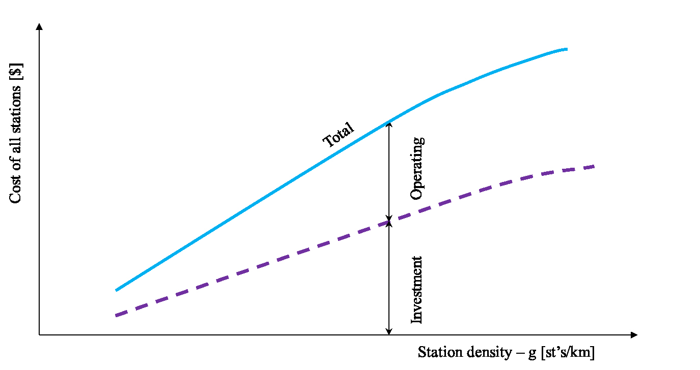The number and locations of stations along a line influence both access and travel time. The number of stations on a line with a given distance is often analyzed through the station density – g, defined as station per km, or the inverse of the average station spacing. For example, if the average spacing is 0.8 km, station density is g = 1/0.8 = 1.25 station/km.