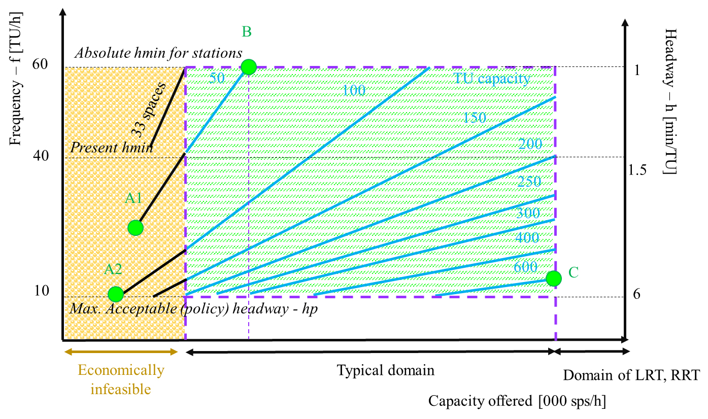 Assuming the maglev TU capacity were smaller than these two metros’ both TU length and capacity will able to operate its fleets with 60 sec headway (60 TU/hr), then the upper boundary were to be established. Such an approach has been commonly used in linear algebra. Considering all the above, a typical operating domain falls into the green area.