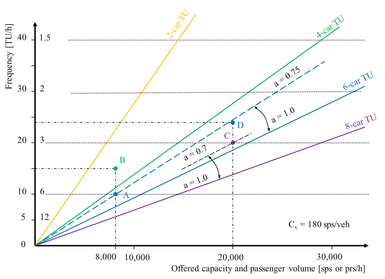 Assumed offered capacity is 180 seats per vehicle. During mid-day period Pmax – 8,000 prs/hr, reasonable choices would be to operate 6-car TUs at h = 6 min with α = 0.75 – point A on the diagram; or 4-car TUs at h = 4 min with α = 0.75 – point B. Suppose that the peak period has Pmax = 22000 prs/hr; then the choices may be to operate 8-car TUs at h = 3 min and α = 0.70 – point C, or 6-car TUs at 2.5 min and α = 0.77 – point D [6].