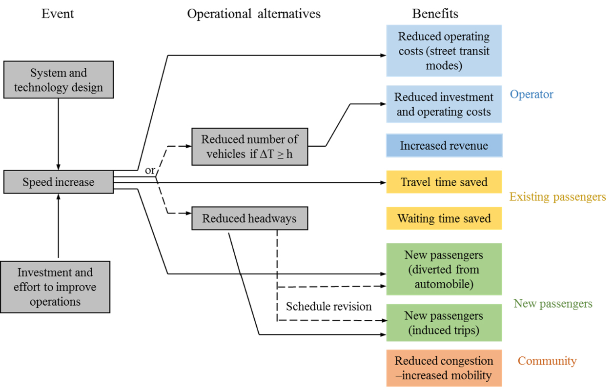 While cities are trying to learn from each other, a dedicated effort to understand systems design and operational measurement is indispensable. Transit system, by nature, has its own boundary. The boundary needs to be meticulously studied. Fig. 10 shows an evaluation of speed increase to different beneficiaries. In addition, vehicle size has a strong correlation with system capacity and maximum load. Knowing system’s capacity and operation limitations are useful to examine whether one system could outperform another under which condition. Fig. 11 shows whether the maglev system could outperform the existing modes depend on speed, cost, and ridership. The condition is given under the same line capacity so that the operating speed of medium-speed maglev is higher than light rail in a right-of-way B environment and high-speed maglev is operating faster than HSR in a right-of-way A environment.
