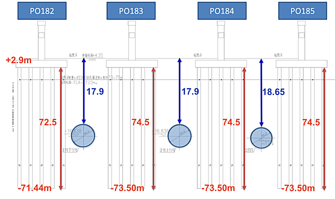There were three lines traversing the maglev between pier 182 to pier 185 respectively of metro line 13, up line, down line and approaching line, the plan shown in Fig. 1. The maximum diameter was 6 760 mm and the maximum burial depth was 18.65 m of the shield of which the third tunnel was a curve of 250 m radius, shown in Fig. 2. The construction face of the project was rather close to the maglev pile, leading to troublesome and risky construction. Deep soil in the vicinity of the shield would produce varying degrees of deformation in the course of shield tunneling, thus leading to the deformation of the maglev pile, cushion cap and column. The project metro line 13 traversing the maglev was a new challenge in the history of engineering technology. Meanwhile, the deformation were effectively controlled and the safe operation of the maglev was guaranteed through comprehensive technical monitoring and protection.