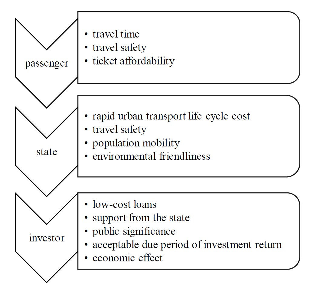 Let us highlight the priorities of choosing urban transport form the standpoint of members of the transport system, that is passenger, state and investor, considering the research [3]. In Fig. 1, the priorities of each of the system’s members are given.