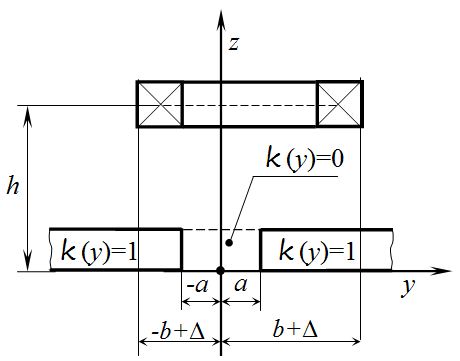 Let us limit ourselves to the case when the width of the air gap 2a is smaller as compared to other typical sizes of the system. In this case, the influence of the joint is mainly connected not with absence of the conductive medium in the air gap |y| < a, but with distortion of the eddy current picture in the guideway, which is caused by the absence of electrical contact between the areas y> a and y<-a. For this reason, the equation (2) can be replaced by its ultimate case with a →0, i.e. by equation: