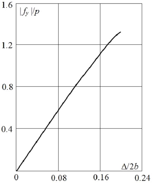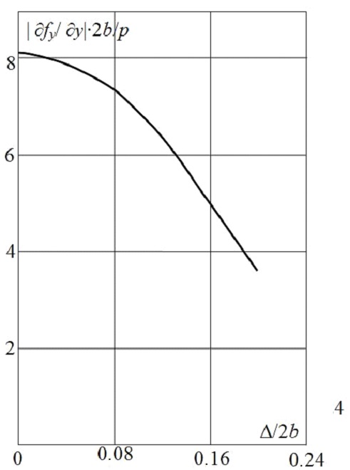 The results of the calculations performed are given in Fig. 3, 4. All charts in these figures reflect the dependence of levitation characteristics on the value of lateral displacement of the vehicle electromagnet relatively to the symmetrical position. The value of displacement is set in the relative units Δ/2b, where 2b – the width of the electromagnet. The calculations correspond to the following set of data: suspension height h = 22 cm, magnet length 2а = 1 m, magnet width 2b = 30 cm, plate width – 5 mm, specific conductivity of material of the guideway σ = 3.4∙107 (Ω⋅m).