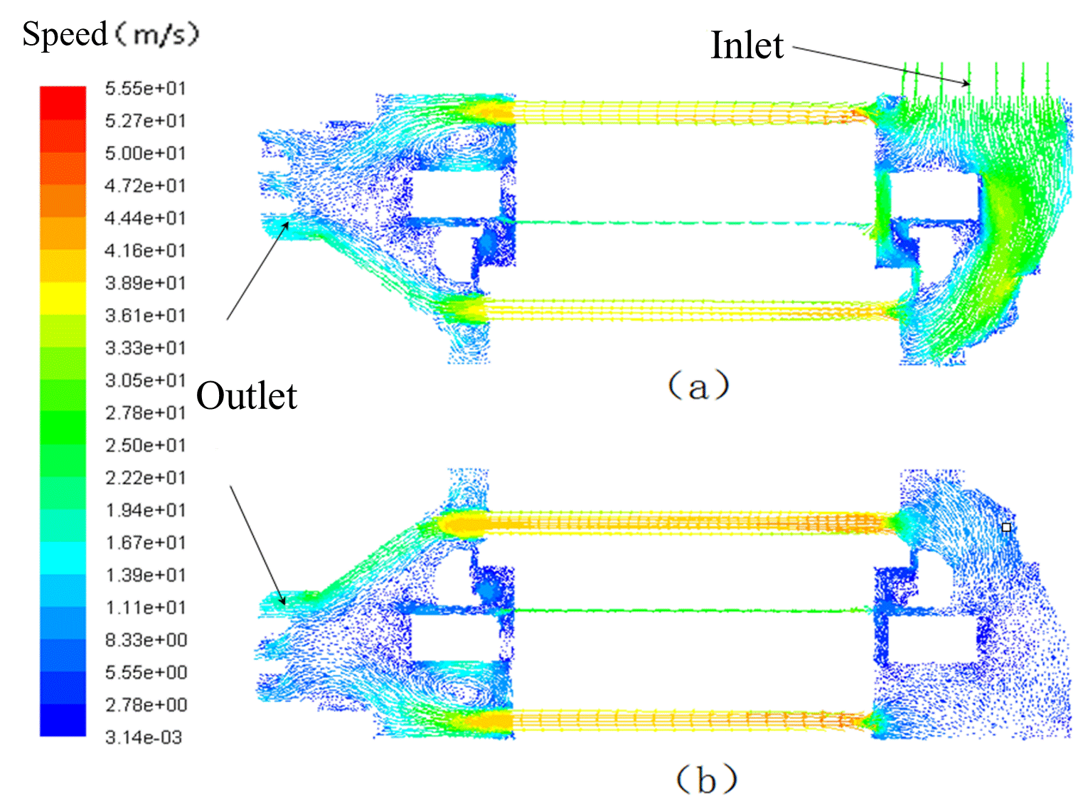 图 3(a). 表示靠近进风口一侧的整体流体流动状态, 图 3(b). 表示远离进风口一侧的整体流体流动状态,现截取并放大进风口部分的流体矢量图并分别分析进出风口机腔以上两个部分的流体流向.