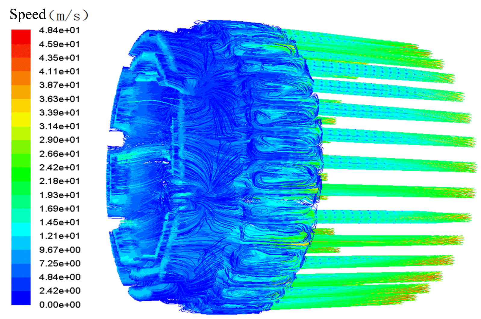 Results: The wind speed near the intake side of stator teeth and rotor teeth groove is less than that far from the intake side. The flow distribution trend of rotor vent is similar to that of stator vent, but the air in the groove is affected by centrifugal force of rotor rotation, which makes the wind speed difference on the intake side larger than that on the outlet side.