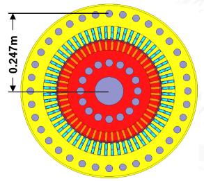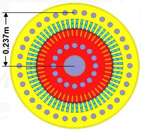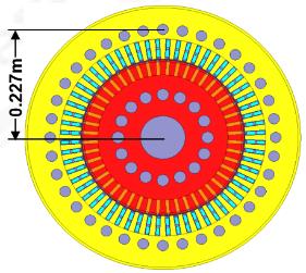 针对原模型的流体和温度分布特点,在不改变电机其他结构的基础上,调节定子通风孔所在的径向位置,分别提出了三种方案,如图 7. 所示. 原始模型定子通风沟所在位置为铁芯径向位置 0.2575 m 处,三个方案分别将通风孔设置在铁芯径向位置 0.247 m, 0.237 m 和 0.227 m 处.