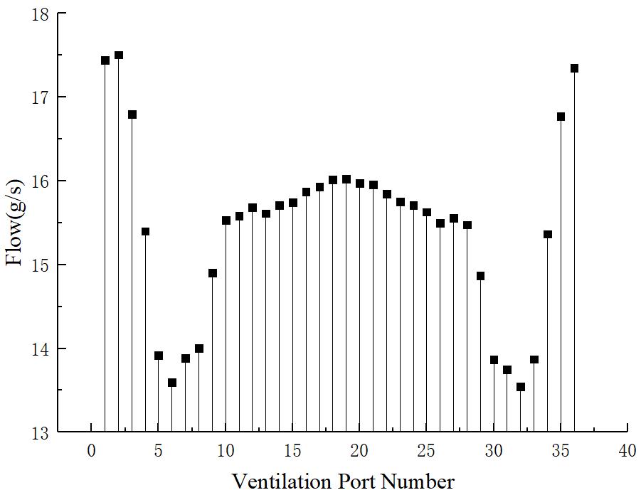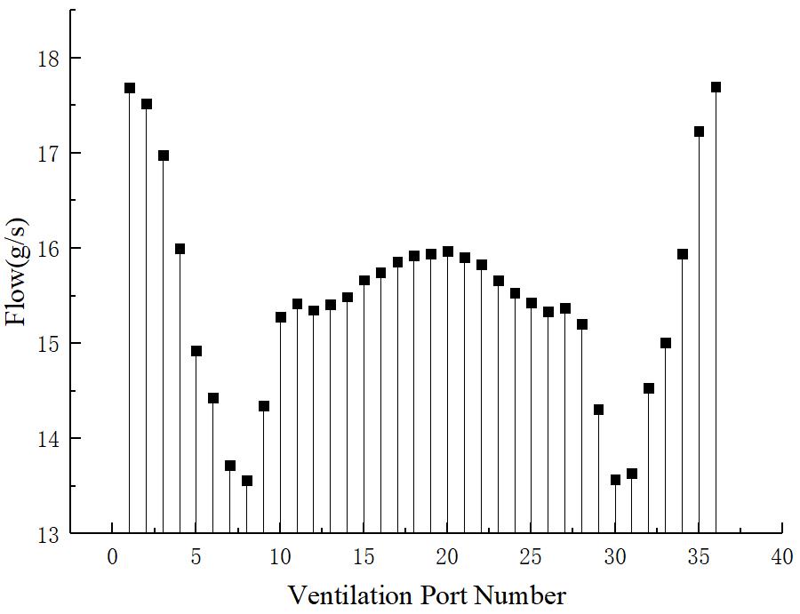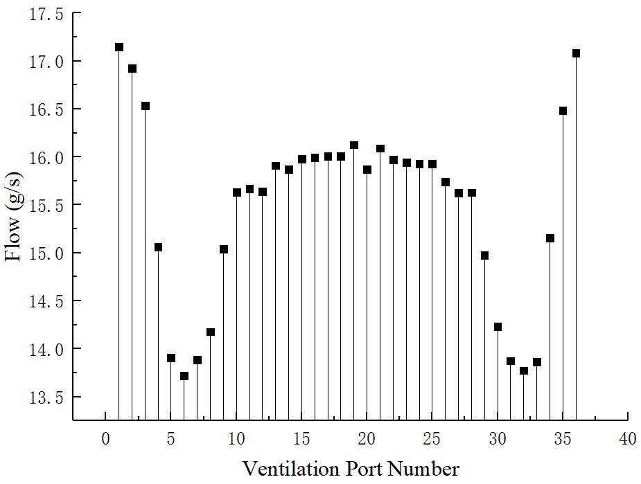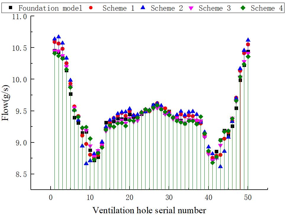 三种方案的风量分配趋势大体相同, 与原始模型不同的是三种方案的流量分配都是正对进风口且靠近其一侧的流量大于远离一侧的流量. 改变通风孔位置对远离进风口一侧的通风孔流量并没有什么影响, 反而增加了靠近进风口侧的流量.