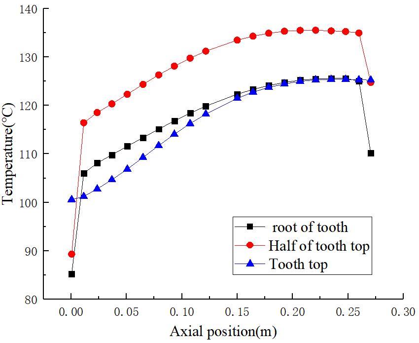 现选取正对进风口且远离其一侧的定子齿进行分析,齿部沿轴向的温度变化见 图 4-7.