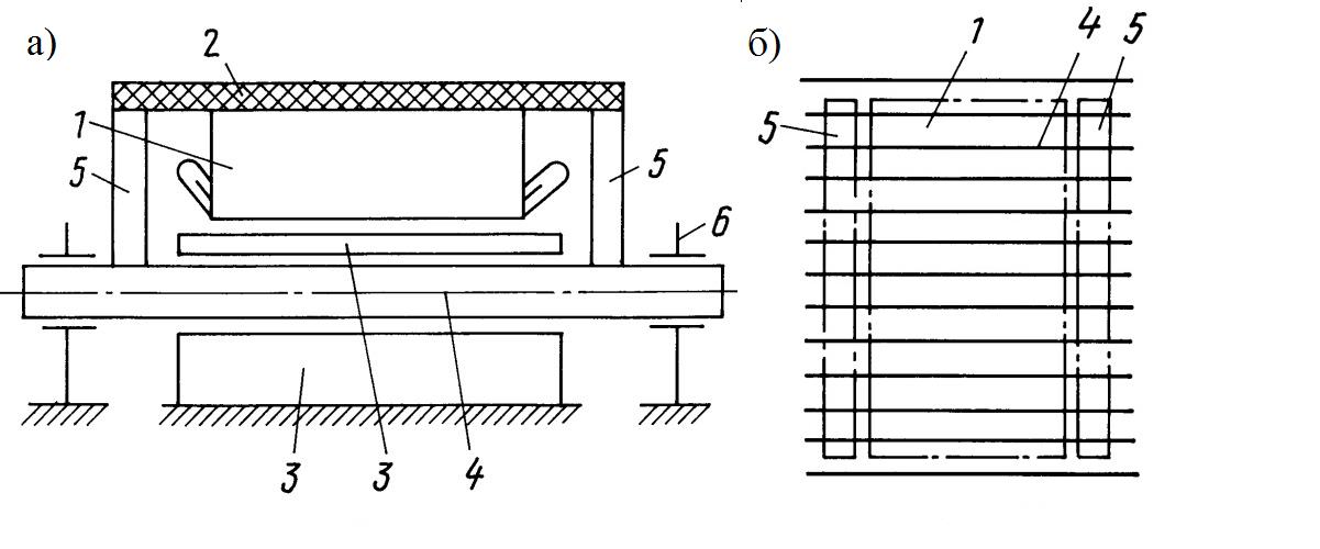 Линейный асинхронный двигатель содержит индуктор 1, состоящий из сердечника и трехфазной обмотки. Индуктор закреплен на планке 2 из неэлектропроводящего материала (Рис. 1, а). Вторичный элемент (путевая структура МЛТ) состоит из сердечника 3 цилиндрических электропроводящих стержней 4, размещенных в пазах сердечника с возможностью вращения вокруг своей оси (рис. 1, б). В пределах длины индуктора ЛАД стержни 4 замкнуты щетками 5 из электропроводящего материала. Щетки 5 установлены по обе стороны индуктора и жестко связаны с планкой 2. Концы электропроводящих стержней 4 расположены в подшипниках 6 (Рис. 1 б).
