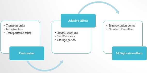 Each transport echelon includes the costs of various types of services, including the profitability of service companies. The cost of service includes the cost of raw materials and resources, including the manufacturers’ rate of return and the cost of transportation, as well as the rate of return of transport companies.