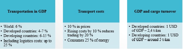 The share of cargo transportation in GDP may reach 25 %, transport costs in the product price – 10 %. The transport itself consumes up to 25 % of production capacity.