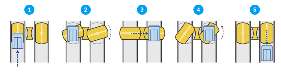 The cabins move in shafts in the same way as trains in rail systems. The linear motor system together with the fact that no ropes are necessary allows vertical as well as horizontal movements inside the building. Even various cabins can move in the same shaft at the same time. In addition this concept allows the use of new and lightweight materials substantially reducing the overall weight of the elevator compared to conventional ones. The functional concept of this MULTI system is illustrated in Fig. 2, and its implementation in a building complex in Fig. 3.