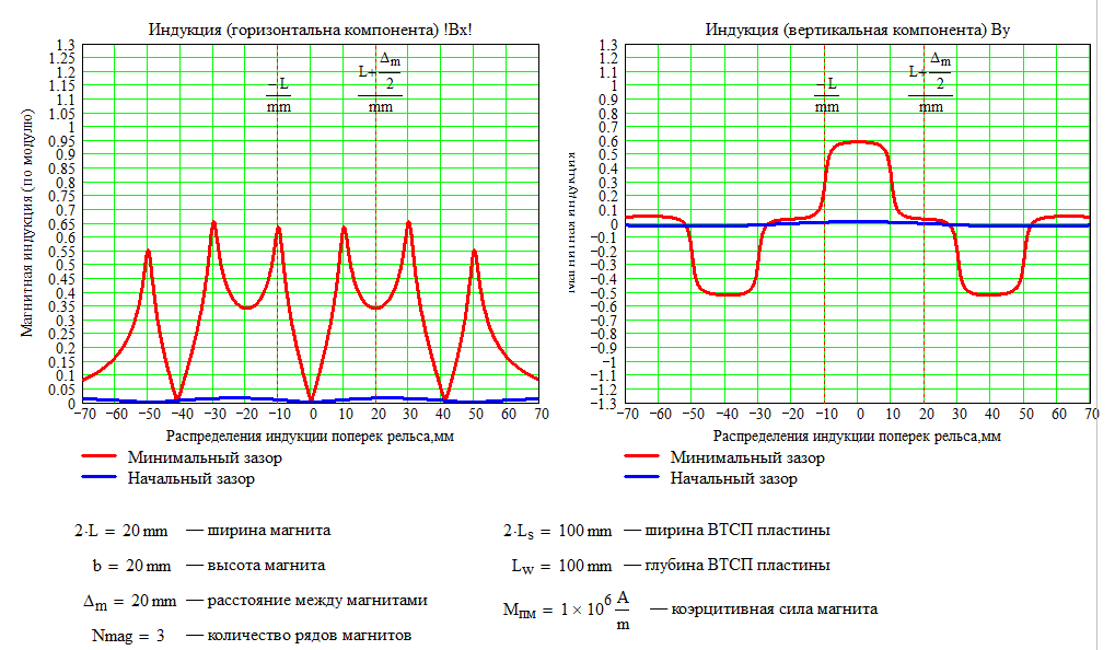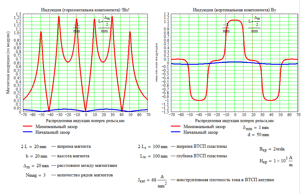 Методики, описанные в [26] были использованы нами при расчётно-экспериментальном моделировании элементов и технологий взаимодействия трассы, которая также включает бесконечно длинный ненасыщенный ферромагнитный магнитопровод, через который замыкается магнитное поле одного или нескольких ВТСП магнитов (М), расположенных на нем и разделенных друг от друга определённым расстоянием и ВТСП подвеса - левитера.