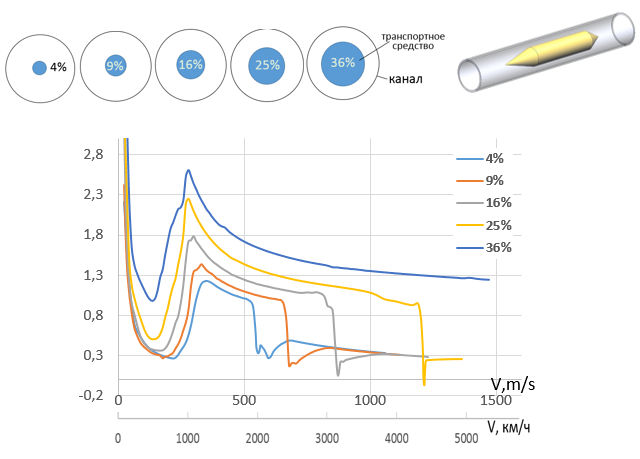 Как нами уже отмечалось ранее [710], сокращение сроков доставки грузов через, например, Панамский канал, с традиционных морских, около 3046 суток, до примерно 15 по «подлёдному СМП», или до, примерно менее 1 суток по коридору на базе ВМЛТ, будет привлекательно для грузоотправителей даже при возможном удорожании стоимости перевозки грузового эквивалента в 1 TEU до, например S1000 из-за ещё большей экономии на уменьшении срока обслуживания кредита, а на базе ВМЛТ можно будет, например, создать новую транспортную концепцию мощных и экономичных, так называемых «энергопроводов». Они смогут поставлять различного класса энергоносители (нефть, бензин, дизельное топливо, нефтепродукты, СПГ и пр.) со скоростями перемещения порядка 6500 км/час (1800 м/с), на расстояния тысячи и десятки тысяч километров, Рис. 3, практически без ощутимых транспортных потерь, при затратах энергии менее 0,004 кВт ч/т км, что является на сегодня наилучшим из прочих конкурентных вариантов [7, 8].