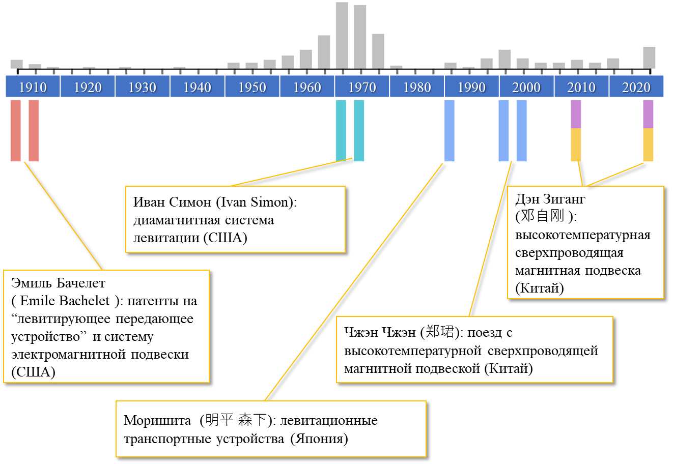 На момент написания статьи (29 января 2019 г.) в патентной базе Google Patents по ключу поиска “magnetic levitation” находились 54565 патентных записей с 1911 г. и по настоящее время.  TOP 1000 результатов по дате подачи заявки (наиболее ранние патенты) представлены на рис.1.
