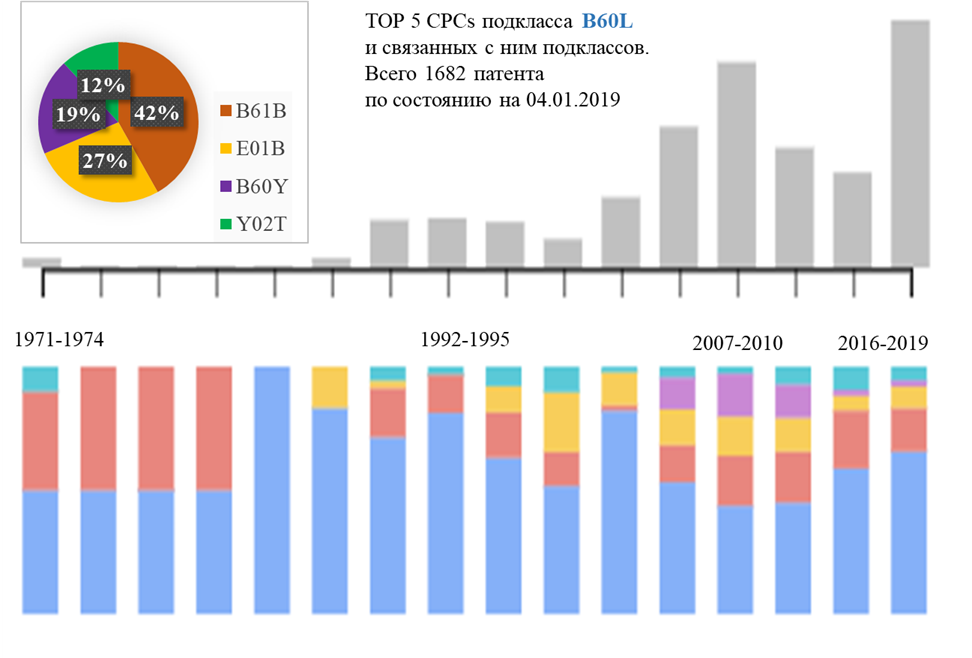 На более глубоком уровне систематизации патентов подкласса B60L в основной группе B60L 13/00 – «Системы электротяги для монорельсовых и подвесных транспортных средств или железных дорог с зубчатыми рельсами; магнитные подвески или левитационные устройства для транспортных средств», анализ патентной базы показывает следующие результаты (Рис. 2).