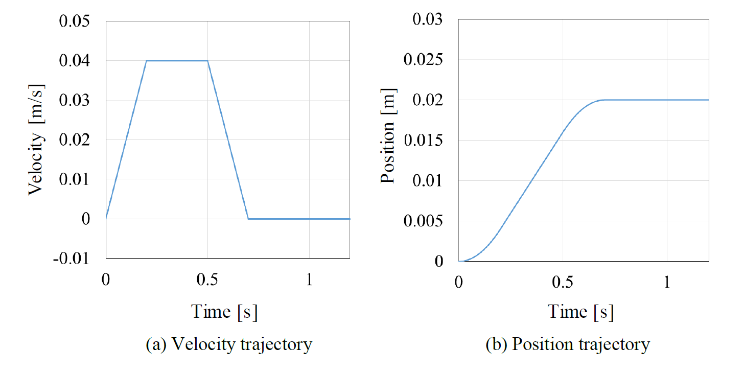 For verifying the dynamic performance under position feedback control, the dynamic characteristics analysis is conducted. The target trajectory is given using a trapezoidal velocity waveform. The analysis patterns using the target trajectory are shown as follows: