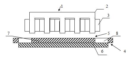 Линейный асинхронный двигатель содержит индуктор 1, состоящий из сердечника 2 и многофазной обмотки, катушки 3 которой образуют ряды в продольном и поперечном направлениях (на Рис. 2 не показаны). Вторичный элемент 4 содержит электропроводящую часть 5, расположенную на ферромагнитном основании 6. Электропроводящая часть 5 содержит сплошную часть 7, расположенную в средине, к которой с обеих сторон примыкают боковые части 8.