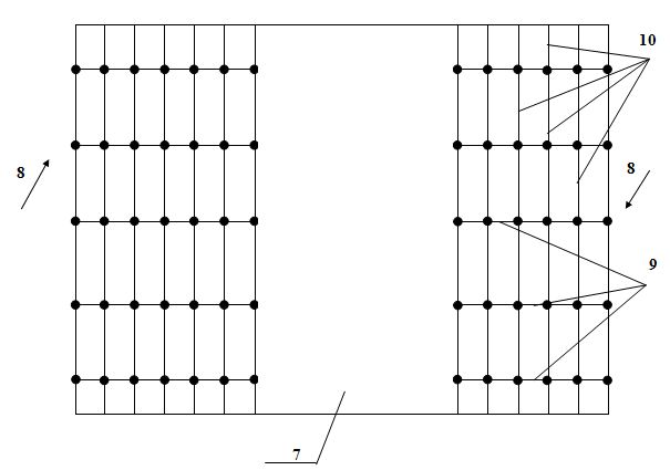 Рис. 3. Электропроводящая часть вторичного элемента: 7 – сплошная часть; 8 – боковые части; 9 – чередующиеся электропроводящие стержни, перпендикулярные сплошной части; 10 – чередующиеся электропроводящие стержни, параллельные сплошной части.