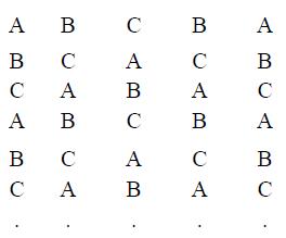 Схема соединения катушек обмотки индуктора представлена на Рис. 4 Прописными буквами А, В и С обозначены фазы, к которым подключены соответствующие катушки многофазной обмотки. Видно, что продольные ряды катушки образуют прямые порядки следования фаз, а катушки каждого поперечного ряда имеют до середины ряда прямой, а после середины – противоположный порядок следования фаз.