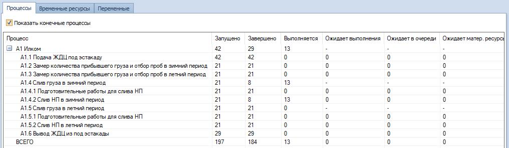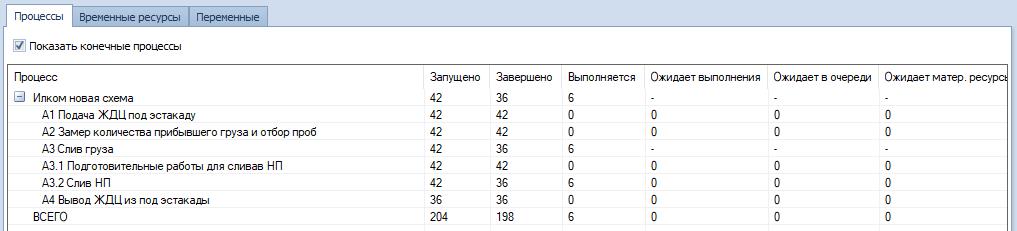 Здесь же мы можем наблюдать количество реализаций каждого процесса: сколько запущено, сколько завершено и выполняется (Рис. 7).