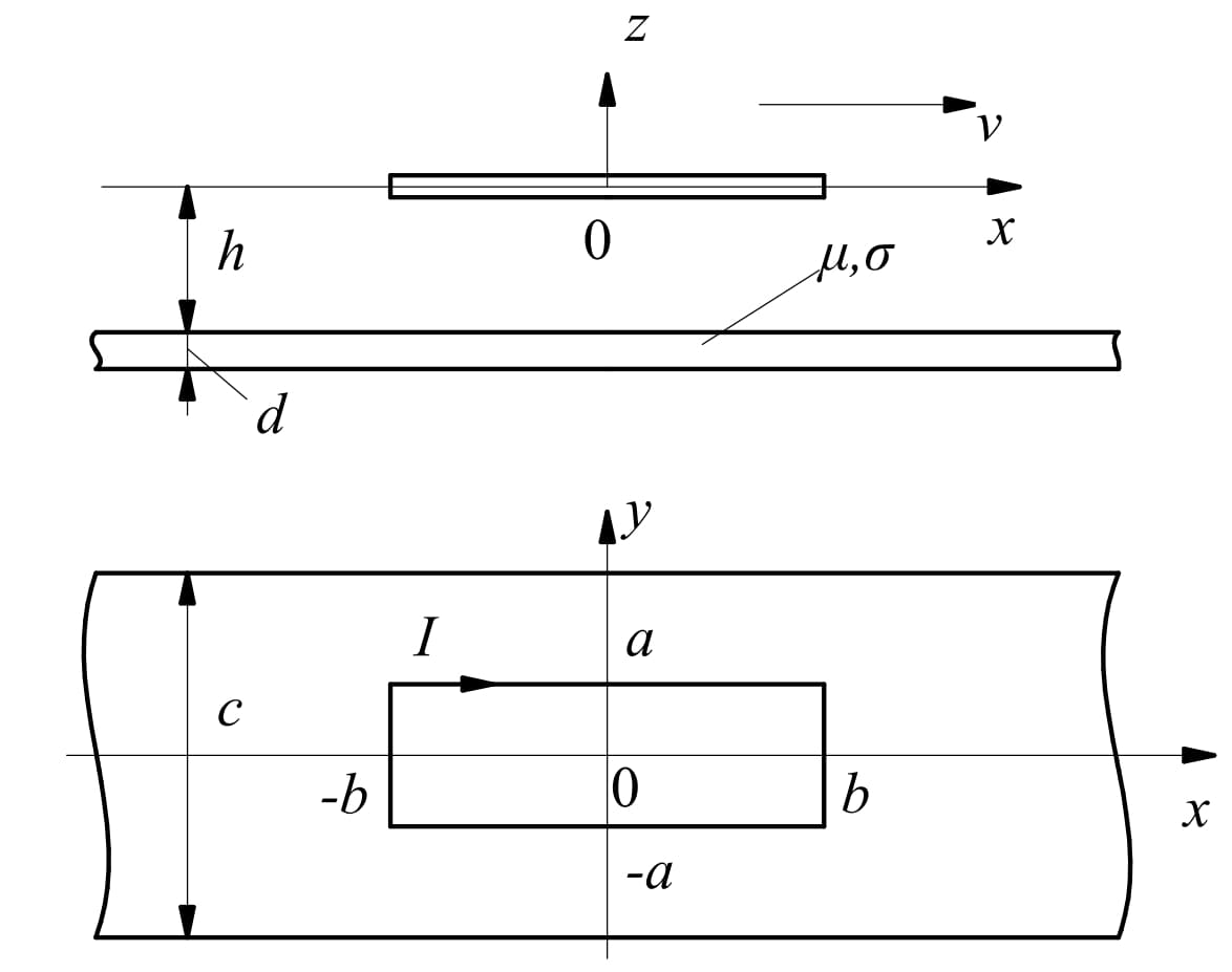 Для решения указанной задачи необходимо рассмотреть электромагнитные силы в системы с учетом краевых эффектов. При этом достаточно ограничиться случаем, когда источник содержит один соленоид (его будет имитировать прямоугольная рамка с током). Рассмотрим модель, представленную на Рис. 1. Здесь обозначены: c иd – ширина и толщина полотна, μ и σ – магнитная проницаемость и проводимость полотна ( ), 2a и 2b– размеры рамки с током I, h – высота подвеса. Токовая рамка движется параллельно потоку в направлении x со скоростью v. Координатная система xyz связана с рамкой. Аналогичная модель, но при полотне бесконечных размеров рассматривалась в [3].