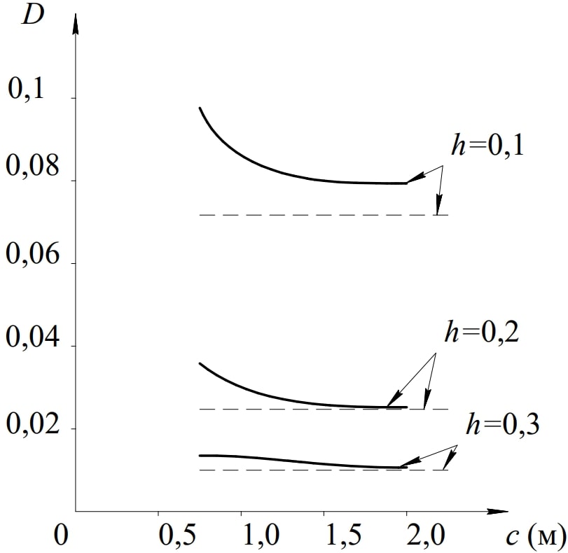 Рис. 2. Зависимость сил торможения D от ширины полотна cпри различных значениях высоты подвеса h
