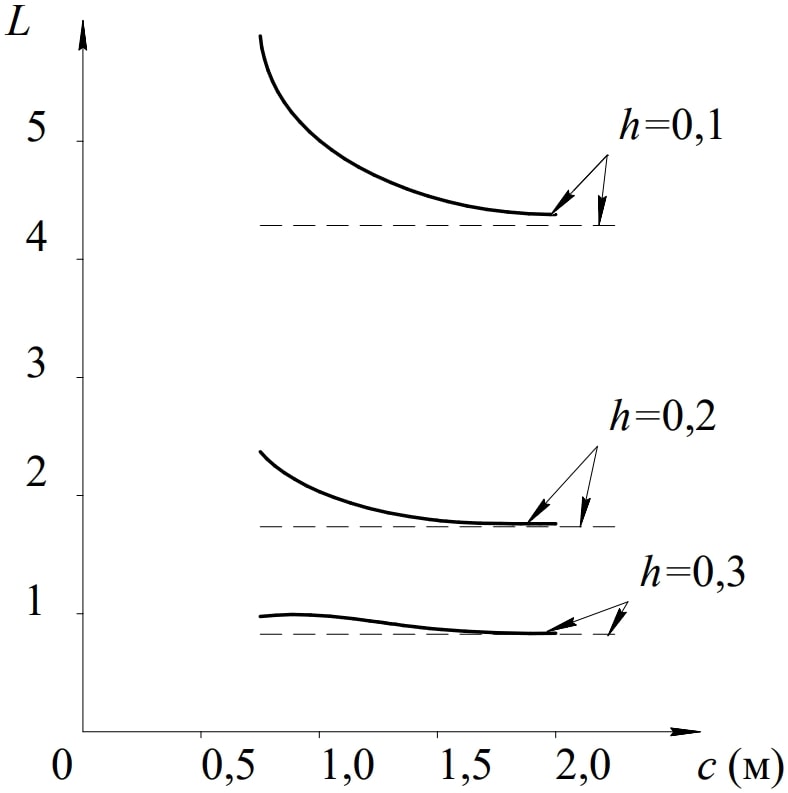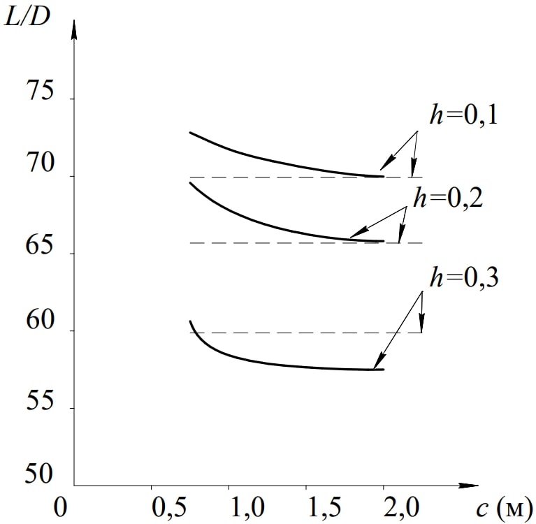 Рис. 4. Зависимость левитационного качества L/D от ширины полотна c при различных значениях высоты подвеса h