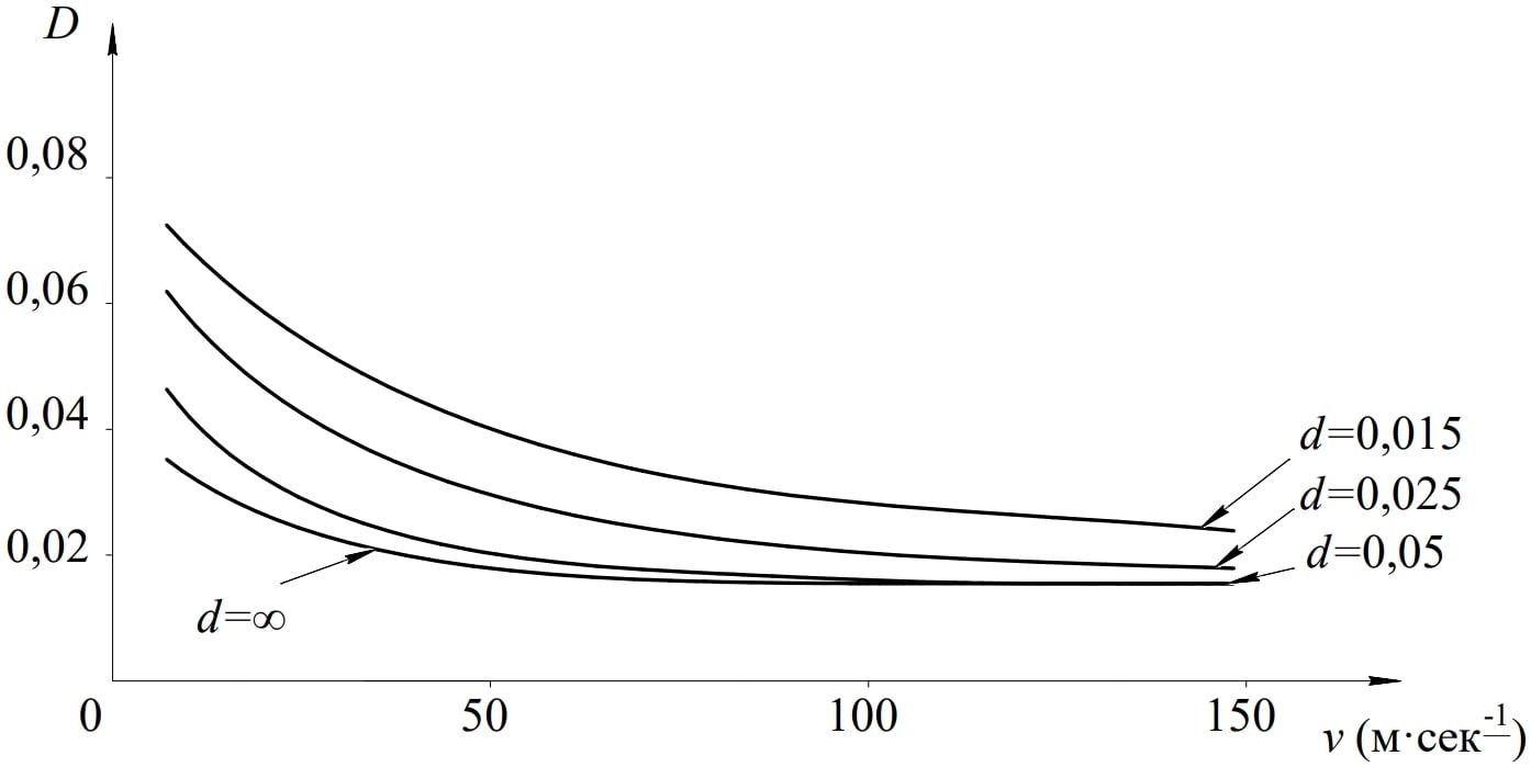 Рис. 5. Зависимость сил торможения D от скорости v при различных значениях толщины полотна d