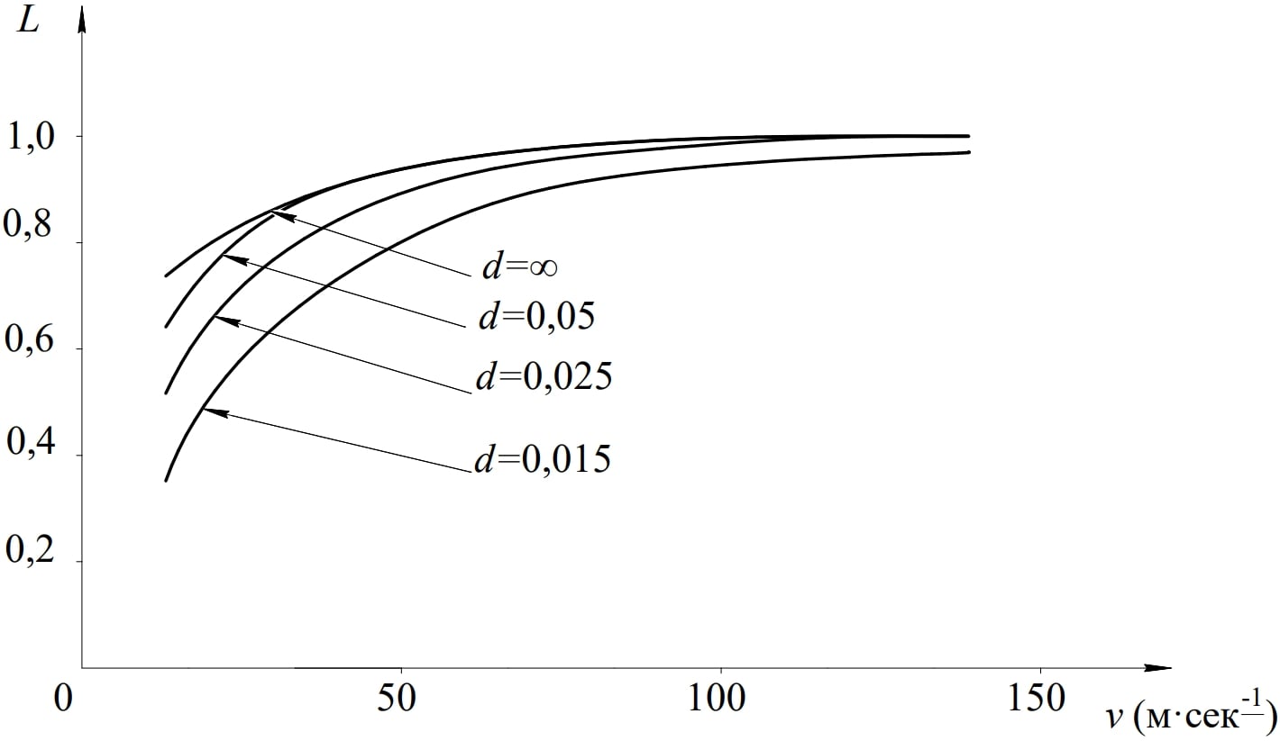Рис. 6. Зависимость сил левитации L от скорости v при различных значениях толщины полотна d