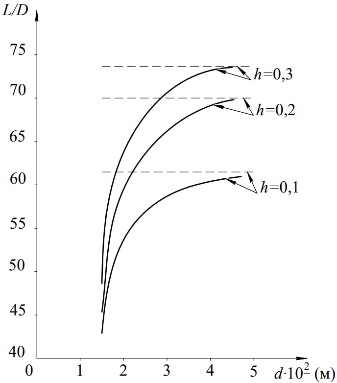 Рис. 7. Зависимость левитационного качества L/D от толщины полотна d при различных значениях высоты подвеса h