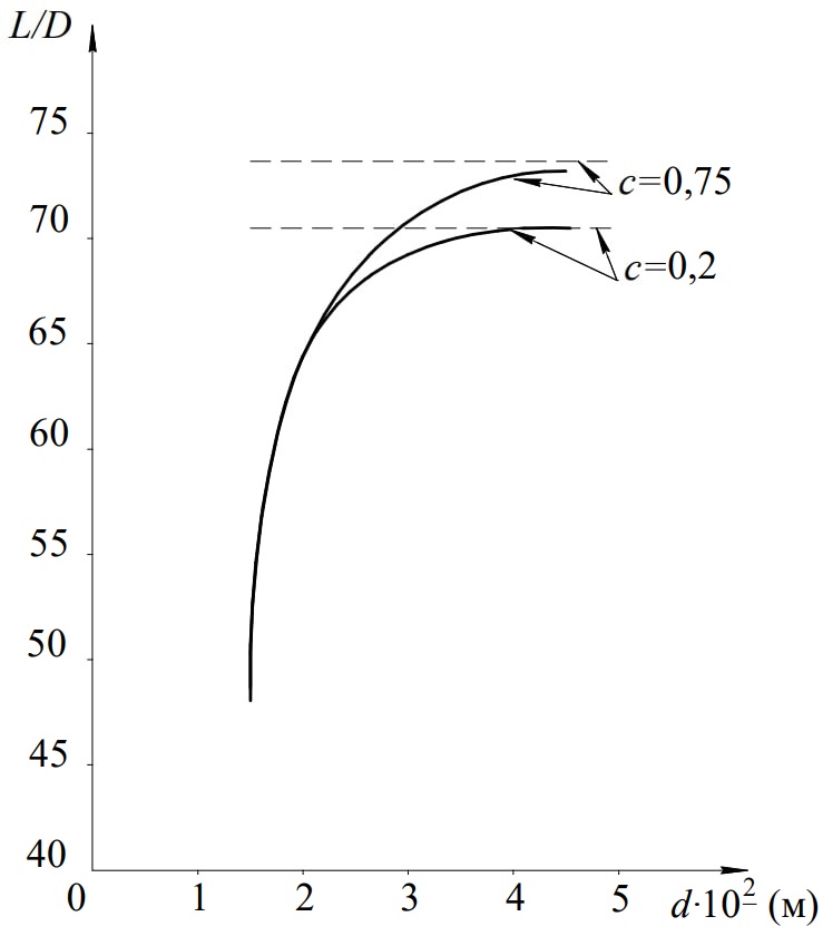 Рис. 8. Зависимость левитационного качества L/D от толщины полотна d при различных значениях ширины полотна с