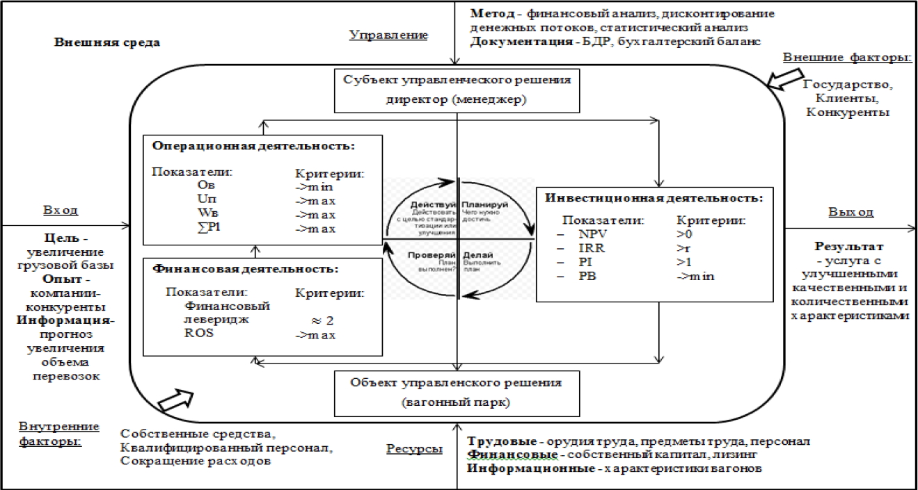 На входе в систему находятся преобразуемые ресурсы, такие как: накопленный опыт компании, компетенции персонала; четко сформулированная цель для достижения результата: реализация инвестиционного проекта по приобретению подвижного состава; условия: наличие имеющихся ресурсов; информация: о прогнозе спроса на грузоперевозки, ставки за перевозку, стоимости нового вагона и его технических и экономических параметрах эксплуатации, условия финансирования сделки и др.