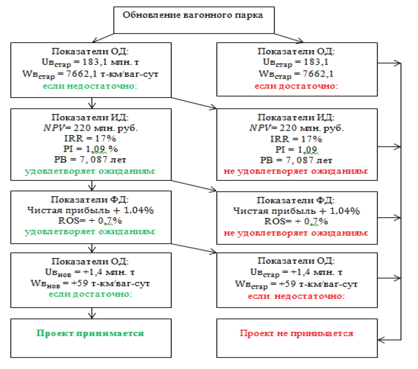 Представленная модель базируется на системном подходе, позволяющем комплексно оценить процесс разработки и принятия решений по обновлению подвижного состава транспортной организации в области операционной, инвестиционной и финансовой деятельности. Приведенный метод «дерева решений» отражает алгоритм процесса принятия решения по обновлению вагонного парка во взаимосвязи трех вышеперечисленных видов деятельности, по итогам прохождения которых принимается решение о реализации проекта по реновации основных фондов.