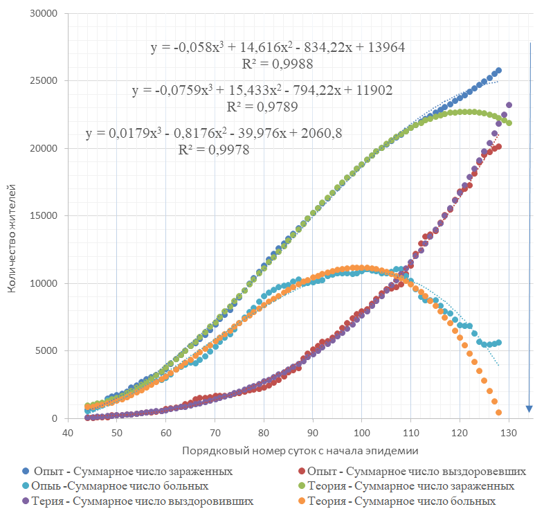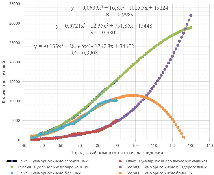 Другими словами, теснота связи между ключевыми показателями и порядковым номером суток составляет 98 % или 99 %, то есть связь практически детерминированная. Согласно моделей, прогнозируемое совпадение числа пораженных и выздоровевших жителей следовало ожидать на 127-е сутки при соблюдении установленного режима ограничения в городе.