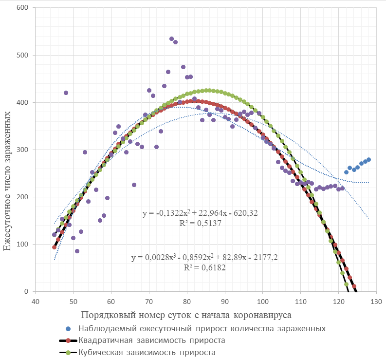 На основании моделирования динамики суточного количества зараженных выявлено, что прогнозное значение роста заражённости, выполненное на 25-е мая (90-е сутки), как по квадратичной, так и по кубической моделям подтверждало приближение прироста к нулю на 126-е сутки.