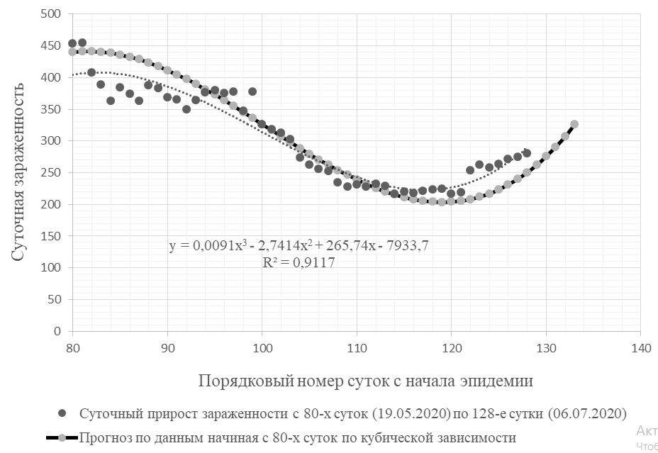 Таким образом, изменение прироста числа зараженных в городе Санкт-Петербурге относительно качественно моделировалось до 114-и суток как квадратичной, так и кубической функциями регрессии, которые были построены по статистическим данным. С учетом отклонения реального хода динамики зараженности от модельного, построенного на 28 июня, выполнено построение новой модели за временной период с 80-х до 128-х сутки (Рис. 4).