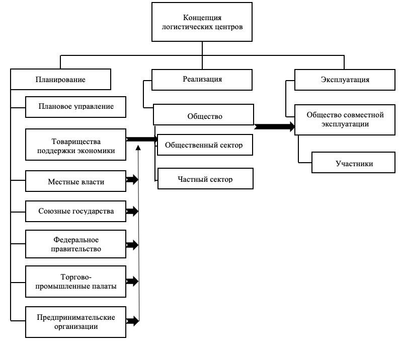 - сильная поддержка со стороны государства, реализуемая через федеральные законы и законы федеральных земель. Немецкая модель предполагает активное участие государственных органов, как на этапе планирования и проектирования, так и на этапе строительства проектов логистических центров;