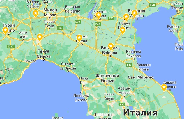Цель итальянской концепции логистических центров – это сосредоточение потоков грузов при согласованной транспортной деятельности, привлечение транзитных грузопотоков по морю. Крупнейшими мультимодальными логистическими центрами на территории Италии являются: Interporto di Bologna, Interporto Marche, Interporto di Novara, Interporto Quadrante Europa, Interporto di Padova, Interporto di Parma, Interporto Rivalta Scrivia, Interporto di Rovigo, Interporto di Torino, Interporto di Venezia, Interporto di Verona (Рис. 3).