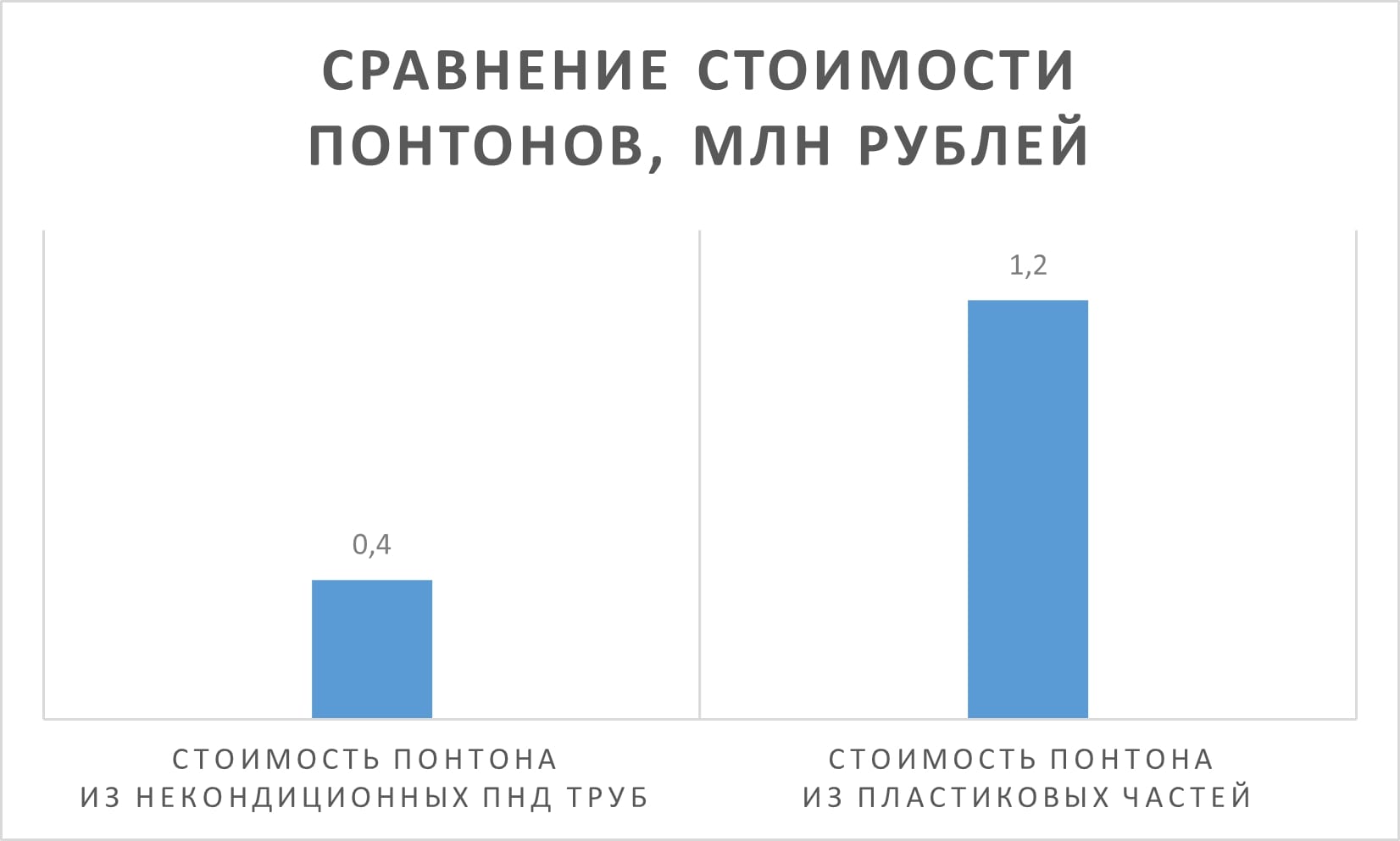 Для сравнительного анализа применения разработанного решения был произведен примерный расчет стоимости понтона, в котором средняя рыночная цена некондиционной трубы составляет 15–20 тыс. руб./т. Для сооружения одного понтона стоимость труб в среднем будет составлять 400 тыс. руб. Анализ стоимостей на рынке аналогов показал стоимость только несущей конструкции понтона аналогичной грузоподъемности на основе пластиковых частей, взятого в качестве прототипа, составит 1,2 млн. руб. [7].