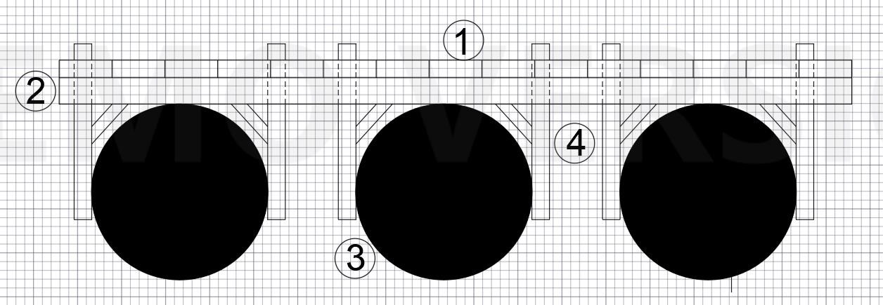 Рис. 2. Поперечный разрез понтонного звена. 1-Поперечный настил; 2-Продольный настил; 3-ПНД труба; 4-Крепление труб