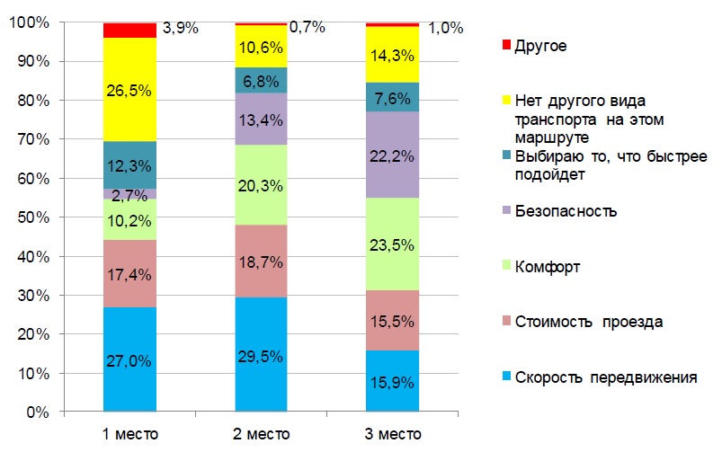 Рис. 1. Распределение ответов респондентов на вопрос о критериях выбора вида транспорта по степени значимости (1 место - самая высокая значимость), % Источник: составлено по данным http://www.mosertolovo.ru/